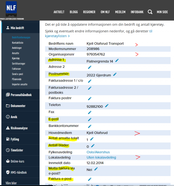 Informasjon som over er merket med rød pil må du gi oss beskjed om å endre - altså endring av hovedmedlem, ønske om bytte av lokalavdeling eller firmanavn/organisasjonsendring.