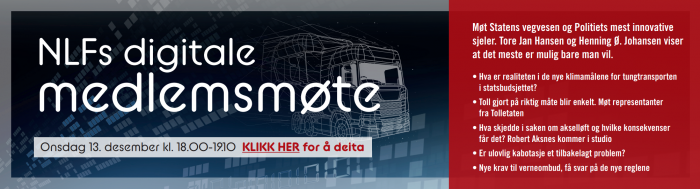 Her får dere årets siste nyhetsbrev fra NLF. Vi minner også om at det siste digitale medlemsmøtet for året sendes fra NLFs studio i St. Olavsgate onsdag 13. desember. Dere vil blant annet møte representanter fra Statens vegvesen, politiet og NLF-advokat, Robert Aksnes i Vectio.