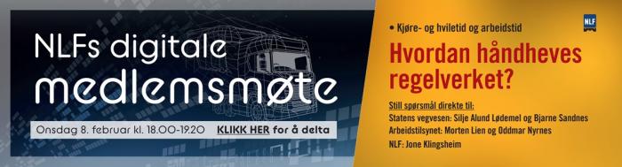 Det er klart for årets andre digitale medlemsmøte, og her vil kjøre- og hviletid være i førersetet. Det er NLFs bedriftsrådgiver, Jone Klingsheim, som skal ta deg gjennom de nye reglene, som er en del av innføringen av mobilitetspakken. I tillegg vil Arbeidstilsynet og Statens vegvesen svare på hva de kan bidra med for å kontrollere at de nye reglene overholdes.