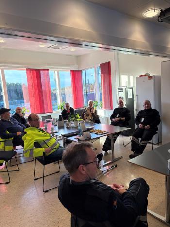 Etter møtet inne var vi ute på plassen og så på vekt og sikring av last, og vi hadde jo passert dato for vinterutrustning, så det ble kontrollert dekk og kjetting.